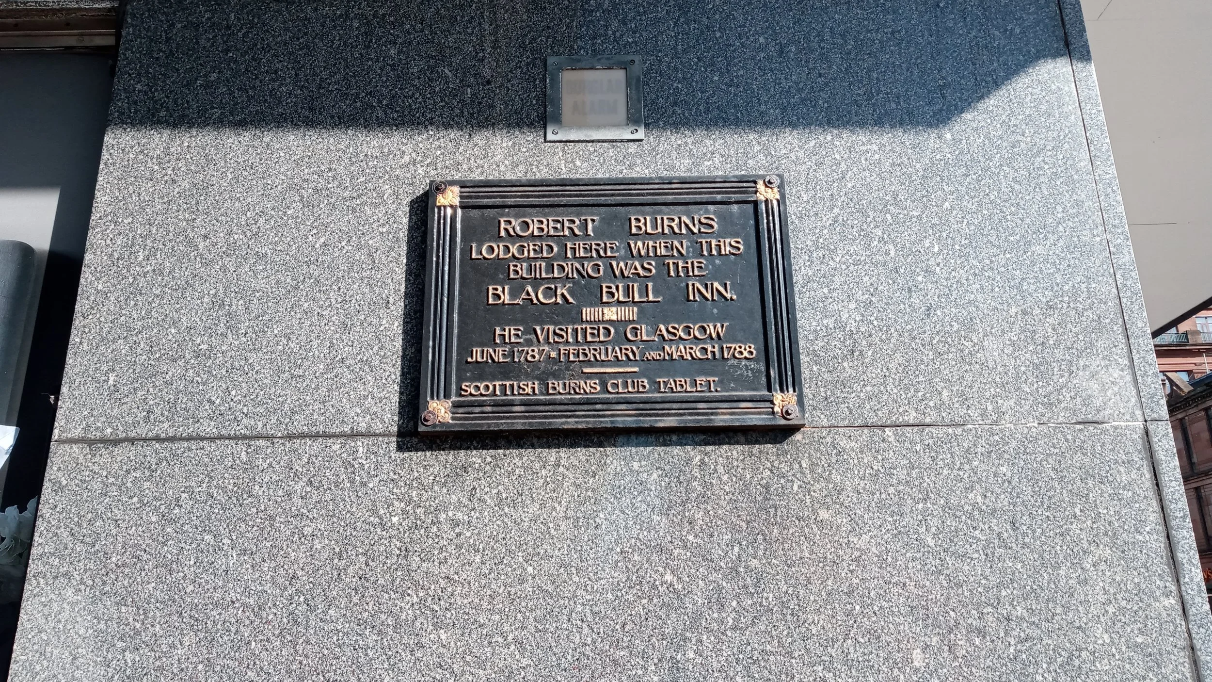 The Marks and Spencer store on Argyle Street is built on the site of the Black Bull Inn and Hotel, once one of the most fashionable venues in Glasgow. One of the most famous visitors to the Black Bull was Scotland’s national poet, Robert Burns, who was resident there on at least two occasions, in 1787 and again in 1788. Those visits are commemorated by a plaque on the Virginia Street side of the building.